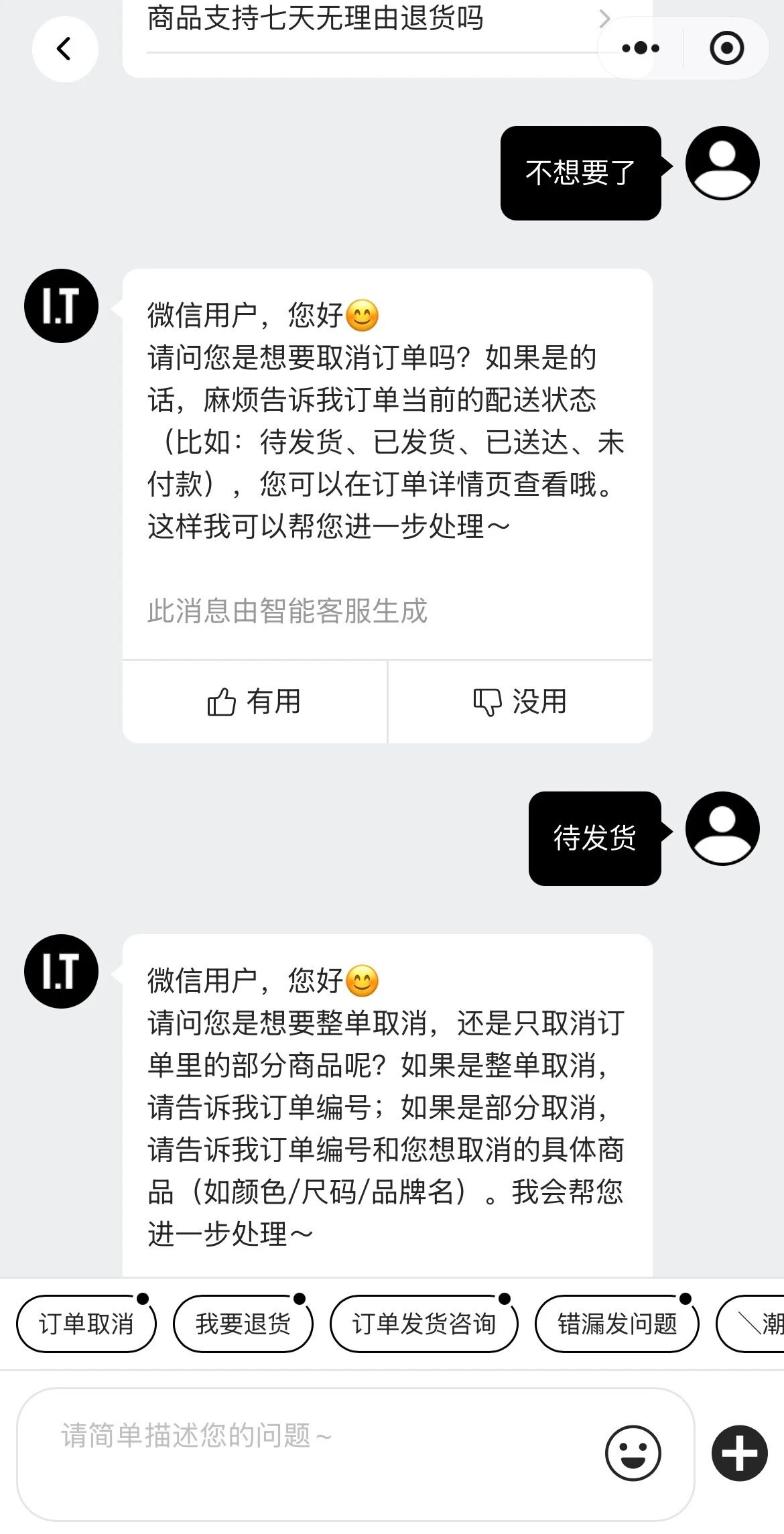 面对上述挑战,I.T通过会话数据分析,优先选择了3个高频、高价值场景进行试点:售前尺码推荐场景、售后订单取消场景、售后退货安抚场景,携手网易云商开启客服Agent的落地实践。