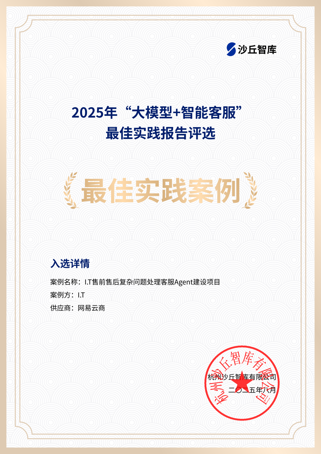 这份路线图的价值,也获得了业界的权威认可。近期,在沙丘智库发布的《2025年“大模型+智能客服”最佳实践报告》中,I.T客服Agent建设项目被收录为零售行业服务模式革新的典型案例。